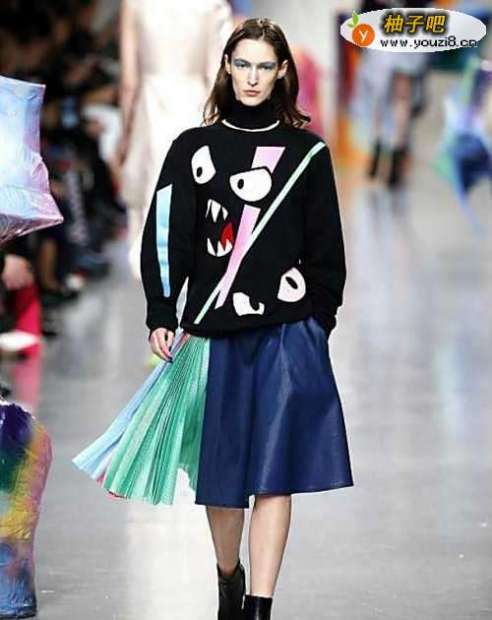4黑色印花宽松毛衣搭配蓝色拼接半身裙搭配黑色短靴,非常有欧美范的撞色感,同时给人一种很强的超级独特感,非常的吸睛而且又很酷。