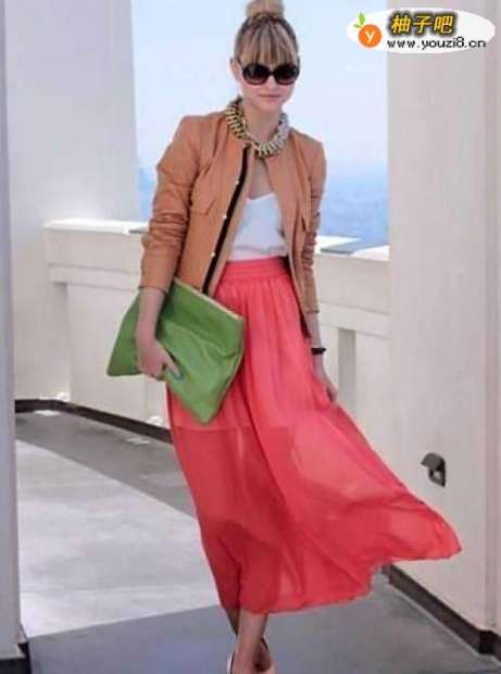 5浅啡色外套搭配白色吊牌红色半身长裙粉红色高跟鞋绿色手拿包,非常有气场的穿搭,再加上适合自己的丸子头,会给人一种明星般的感觉,同时有着很好的减龄效果。