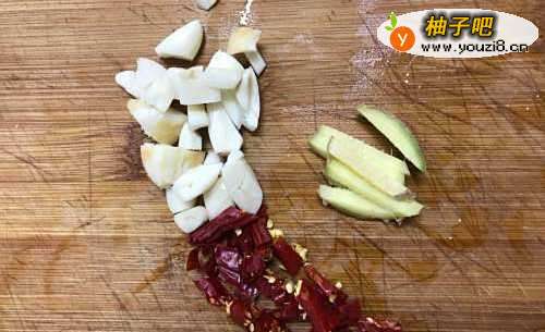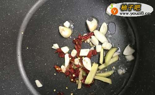 4锅里放油烧热,放干辣椒大蒜姜炒香。