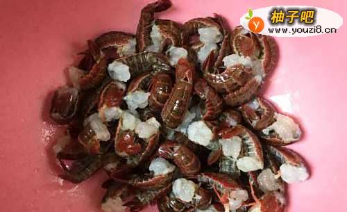 2去头,从中间一扇尾巴抽出虾肠。放料酒、盐腌制半个小时后沥干水。