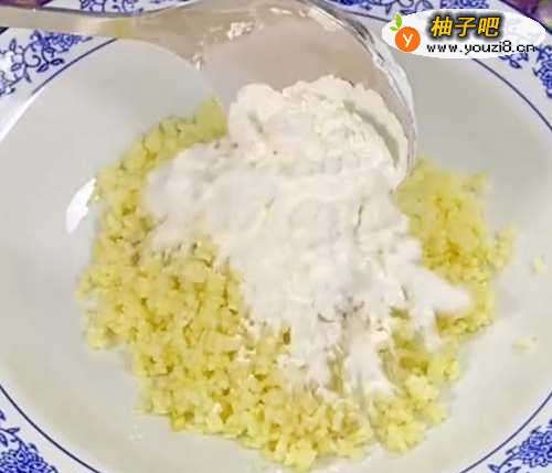 2放到盘中,加一大勺糯米面粉和适量的白糖,搅拌均匀,然后揉成一个个丸子。