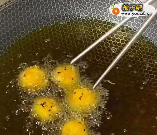 4锅中油温四成热,然后把丸子一个个放进去,用小火炸,炸至丸子全部飘上油面就可以捞上来,苹果丸子就做好了。