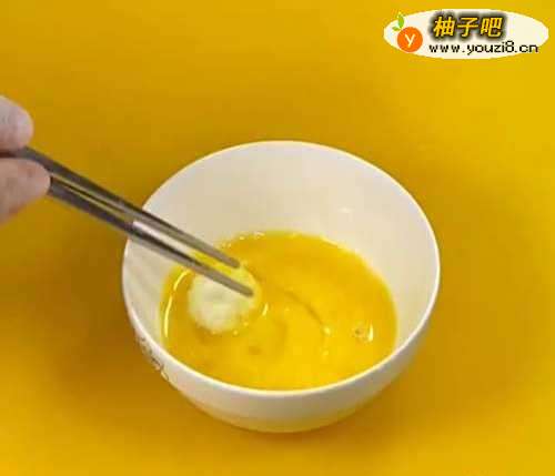 3把丸子放到蛋液里,再放到面包糠滚,然后用手轻轻的揉几下,防止面包糠脱落。
