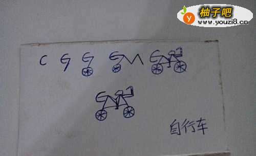 5第五张、自行车、这个大家就对付看吧、不是很好、还请见谅、都是凭借想象画的、不过我女儿一看就知道是自行车、而且,我在后面加了个小坐、带棚的、我画的、可是天天带我闺女出去压马路的工具喔、你们能看 出是自行车吗??
