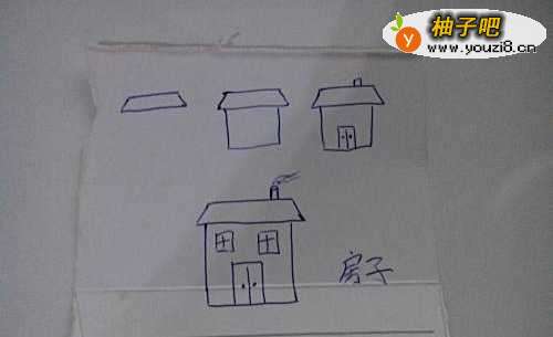3第三张、小房子、一个梯形做房顶、一个正方形做房身、然后加上田字格当窗户、在加个门、放上门把手、在方顶上在加个烟囱、然后弄点烟雾、是不是很形象呢、看上去还可以吧、