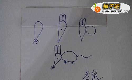 第一张、小老鼠、先画一个萝卜样子的当头、在画耳朵(虽然老鼠耳朵很小、可以凭借想象去做修改)、然后画个椭圆形的当身子、最后来一条线做尾巴,来点弯、那样看上去比较形象、简单吧、