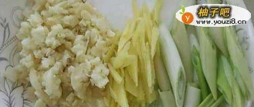 3接着,准备好我们需要的配料:把蒜拍碎之后切碎,把姜切成一条条的姜丝,把小葱切成葱段。