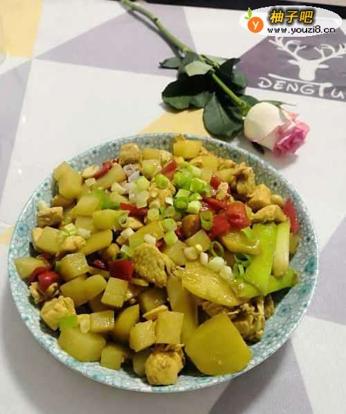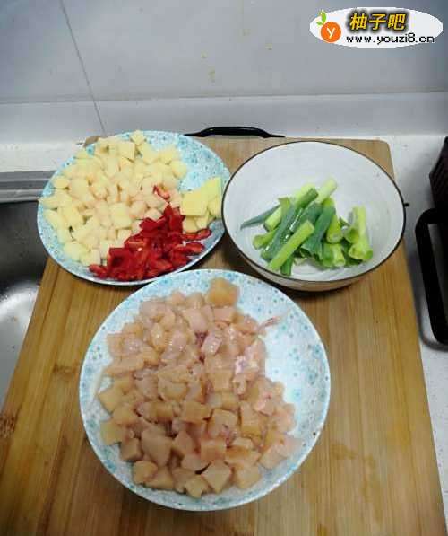 土豆、鸡胸肉、红辣椒切丁,葱白切段、葱叶切碎,熟花生准备好。