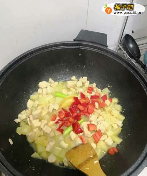 5倒入土豆丁翻炒均匀后、加入适量水焖煮1分钟。