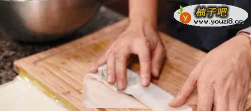 5取出春卷皮,光滑的一面朝外,舀2勺调好的馅料,包起来;