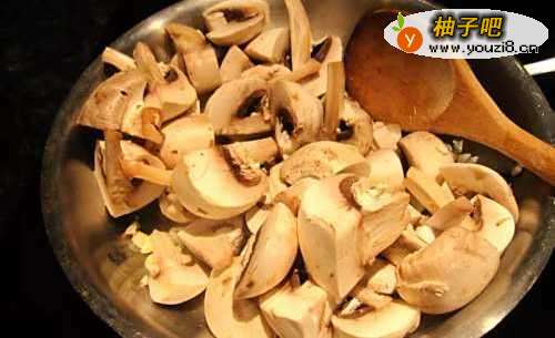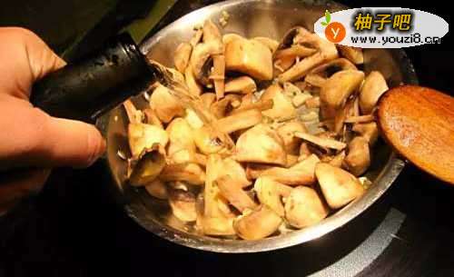 4一开始先别加水,慢慢炒,蘑菇会自己冒出汤汁