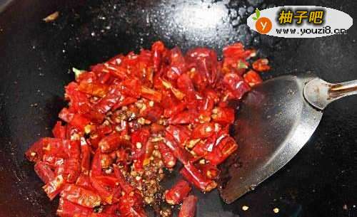 4再次,在锅里倒入适量的菜籽油,烧热后,放入花椒、生姜片、红辣椒段、蒜泥等进行爆炒一会儿,倒入到小盆子中。