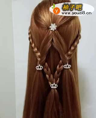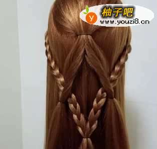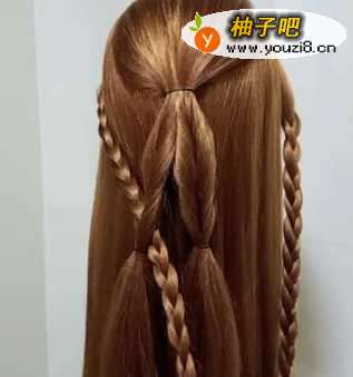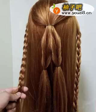 3接着再把两缕头发中间都掏个洞,然后分别把下面的两缕头发分别从两个洞里穿过来,然后弄整齐