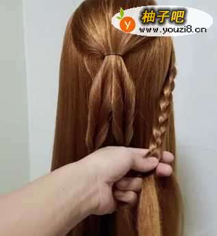 5接着左侧也跟右侧一样的步骤,选出三缕头发,然后编成麻花辫,帮到最下面用皮筋固定好