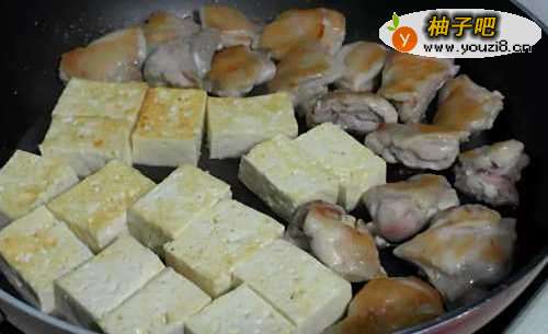 2鸡油煸出来后放入板豆腐煎至两面金黄,过程中也顺便帮鸡肉翻面