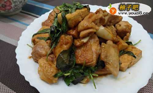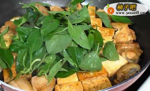 4确认鸡肉熟后放入九层塔炒出香味即可