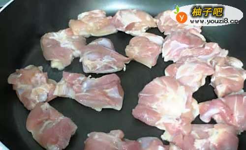 去骨鸡腿排切成适当大小。热锅不加油,鸡皮朝下以中小火煸出鸡油