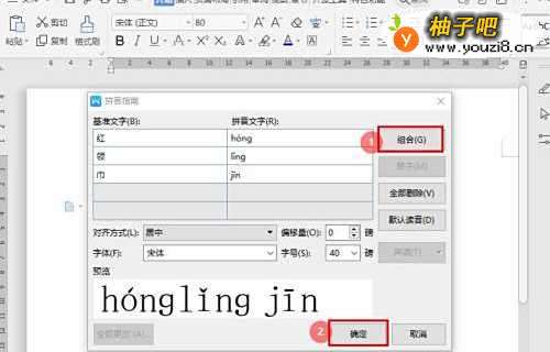 4在”拼南指南“对话框中,点击【组合】—【确定】生成拼单拼写:hónɡ lǐnɡ jīn 。