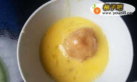 4将包好的肉丸,放到除去蛋清的蛋黄里面,来回滚动,然后再捞上来。