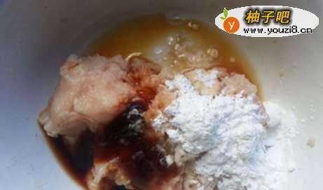 2接着往刚绞好的碎肉泥倒入适量的淀粉 鸡蛋取蛋清,加入耗油 五香粉用筷子来回搅拌均匀同时加盐还有料酒。