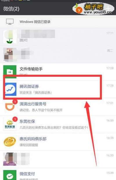 4关注“腾讯微证券”以后来到聊天记录的这个页面,然后找到“腾讯微证券”,一般都显示在最上方。