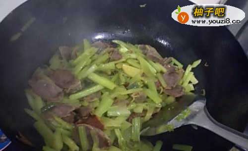 7等芹菜颜色变浅,说明芹菜已经炒熟了。这时可以加入适量鸡精出锅。