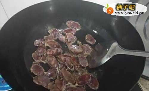 3起锅上油,倒入少量油,油热后把香肠倒入锅中翻炒。香肠因是五花肉制作,本身在炒的时候也会释放油脂。