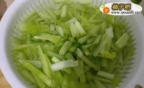 2芹菜摘好洗净,然后切成小段放入盆中再次洗净。