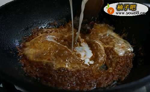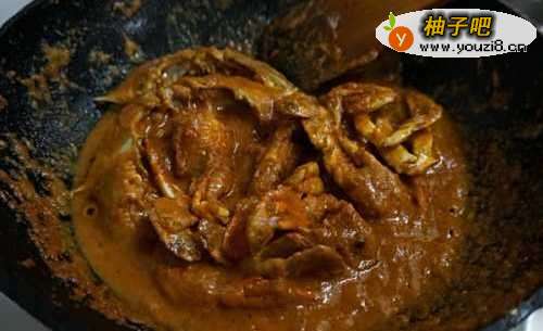 然后加入咖喱酱炒出红油,倒入椰浆,调入鱼露、白砂糖和盐搅拌均匀,放入蟹块煮3分钟。