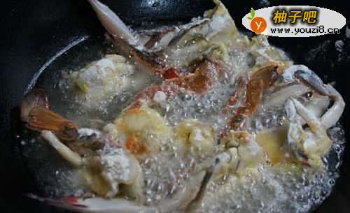 3炒锅中注入较多油,大火加热至六成热,蟹块先在蛋液中蘸一下,