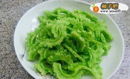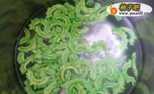 苦瓜洗净去籽切片。(苦瓜里面的白膜要抠干净,不然炒出来的苦瓜会很苦。)