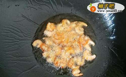 5热锅倒油,放入虾干煸炒至表皮有点焦焦的感觉,然后倒入蒜末炒出香味来。