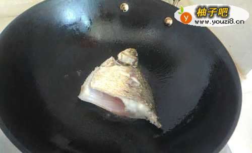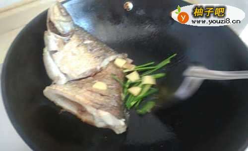 2起油锅,先加入少量盐,防止粘锅,将鱼放入锅中,煎到一面金黄,翻身再煎,这样可以去除泥腥气,如图: