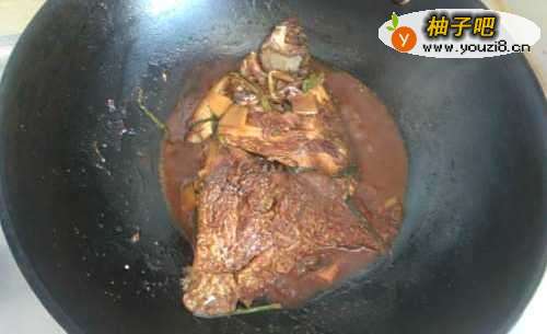 4加入料酒,这样可以去除泥腥气。再依次加入红酱油,盐和糖,焖煮10分钟,如图: