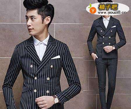 4西装是每个男士都少不了的单品,想要穿出型男的帅气,那么条纹西服套装就是最佳的选择,时尚的竖条纹西服套装,内搭T恤或衬衫,凸显了男人的成熟魅力。