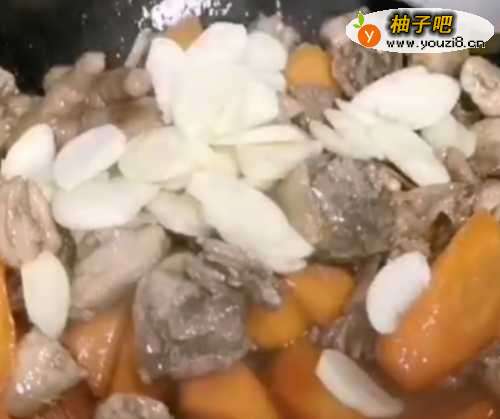 6然后,加入大蒜翻炒一小会,再加入适量清水焖一会;