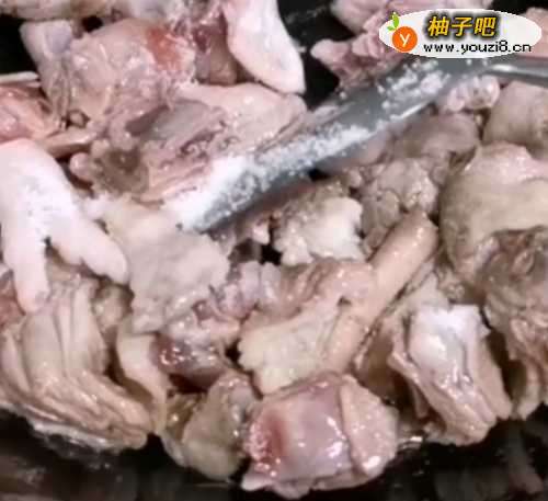 2然后,加入适量盐,将鸡翻炒微微出油;