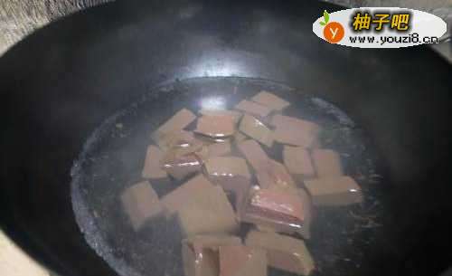 5加入鸭血,进行翻炒,加一点食醋提味去腥。