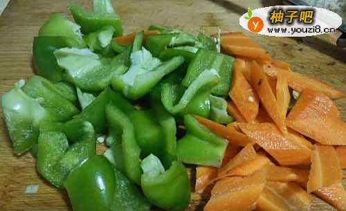 青椒切成小块,最好是斜刀块,胡萝卜切成薄片,然后切成菱形块!