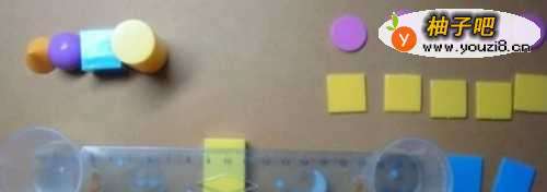 首先把制作简单的天平秤的工具和材料准备好,有多种立方体、小量杯、图形片、直尺等,如下图所示。