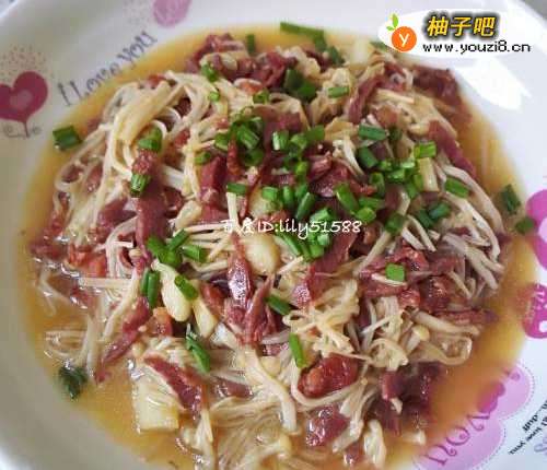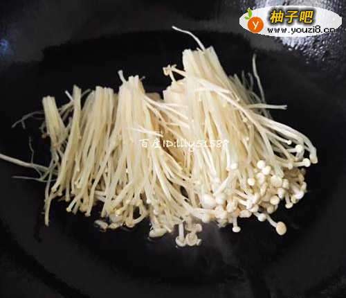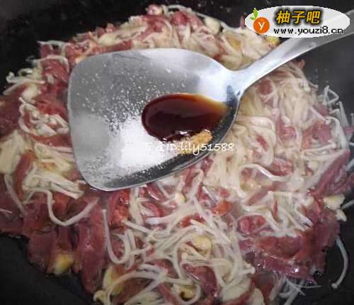 6放入金针菇炒1分钟变软了之后,放入牛肉一起炒。