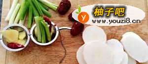 白萝卜取小段去皮切薄片;葱切断、姜切大片,洗净沥干红枣,准备几颗茴香、八角、干辣椒、一片香叶