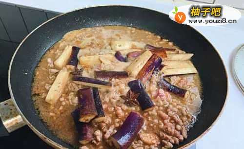 3炒至猪绞肉2、3分熟时,加入茄子翻炒