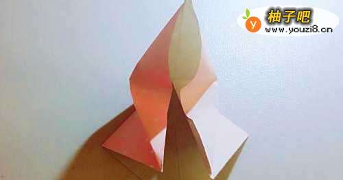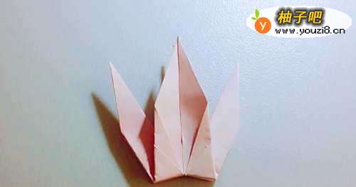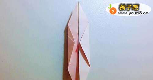 12把左侧的纸向下折叠一点,折出千纸鹤的头。载着一颗心的千纸鹤就折好啦,把它放飞到你爱的人身边吧