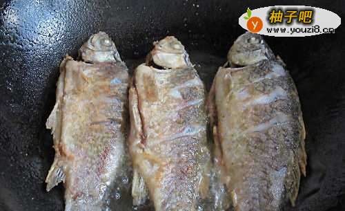 3锅预热倒入油,烧至6成热时,放入鲫鱼,矿宙锅拿起慢慢摇晃,煎至微黄翻过来煎另一面