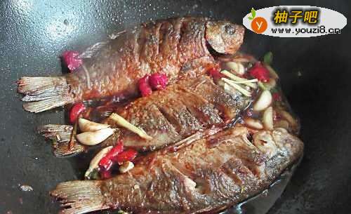 4将煎鱼多出来的油倒出,锅内倒入酱油、生趴注近姜、辣椒、花椒、蒜粒,焖半分钟