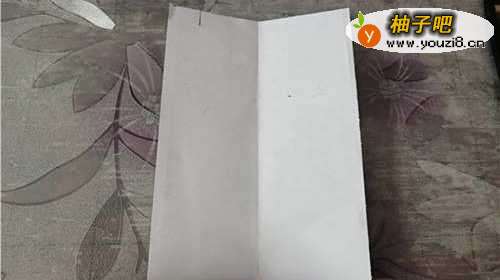 先把长方形彩纸的左右边对折,再把上面的角向下折,如下图所示。
