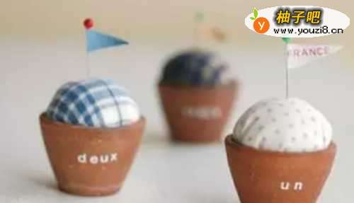 5把圆球状的针插包塞进迷你小花盆中,用白乳胶或UHU胶水固定一下,一个可爱的迷你花盆针插包就做好了。
