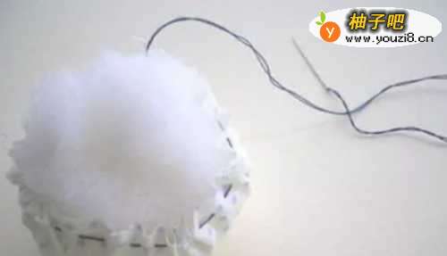 3在圆形布料中间放上适量的珍珠棉,并开始抽紧疏缝线,最后把珍珠棉完全包裹进去。