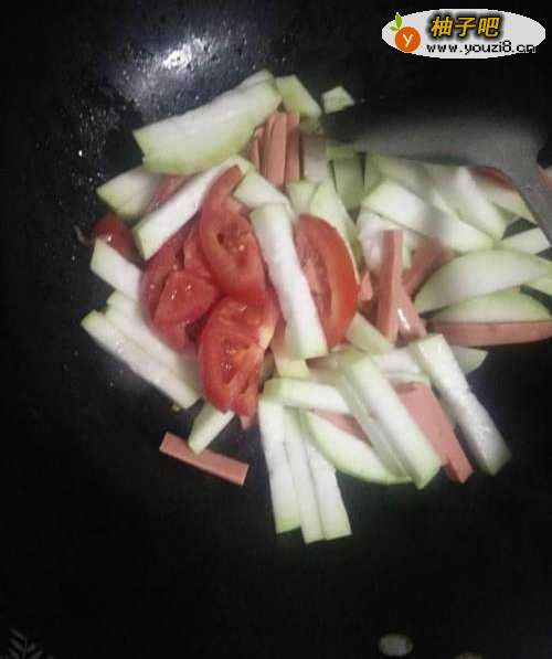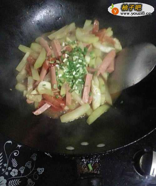 5锅中放入花生油。然后马上把火腿,节瓜倒入锅中爆炒。